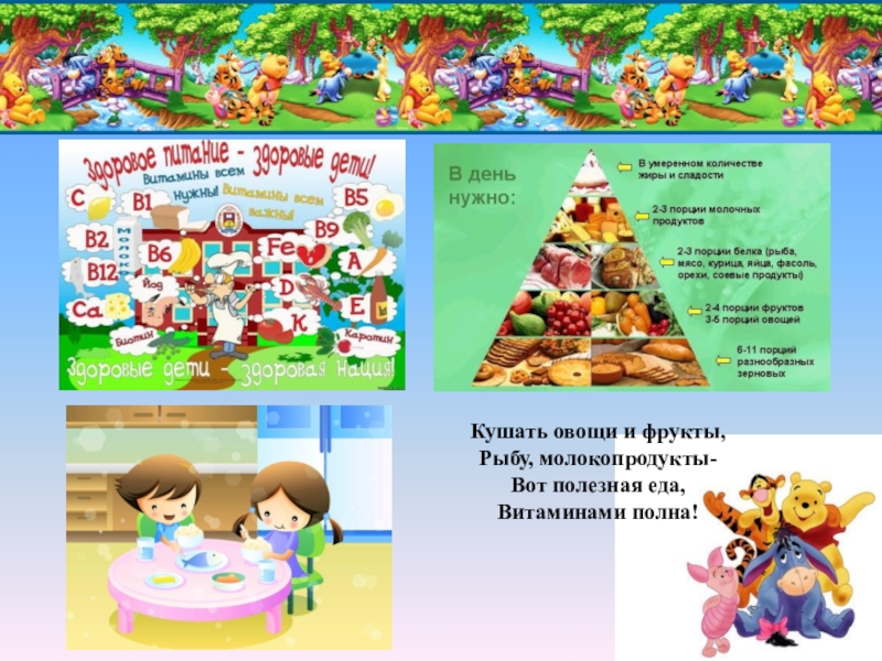 Кушать овощи и фрукты,  Рыбу, молокопродукты-  Вот полезная еда,  Витаминами полна!