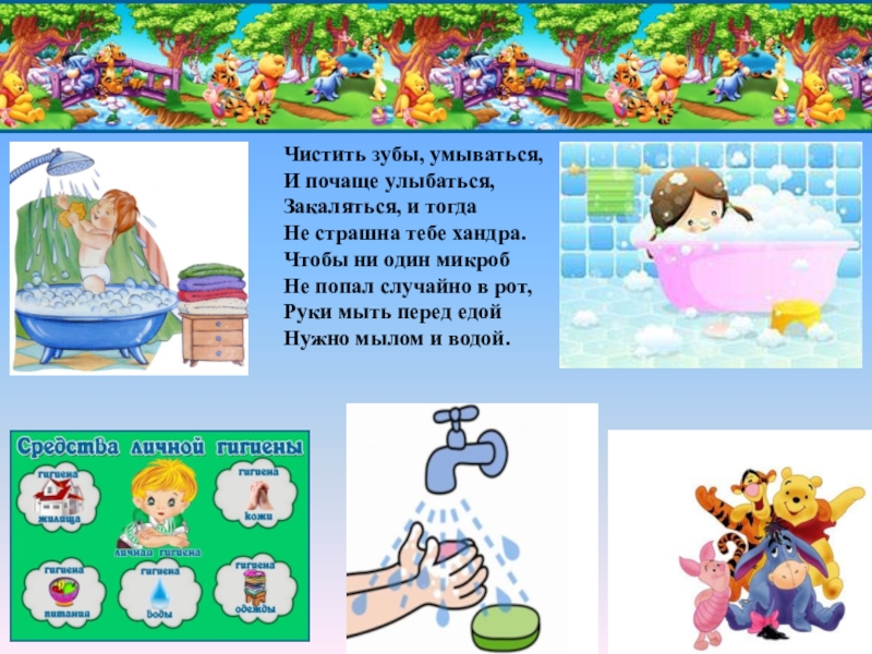 Чистить зубы, умываться,  И почаще улыбаться,  Закаляться, и тогда  Не страшна тебе хандра.Чтобы ни один микроб  Не