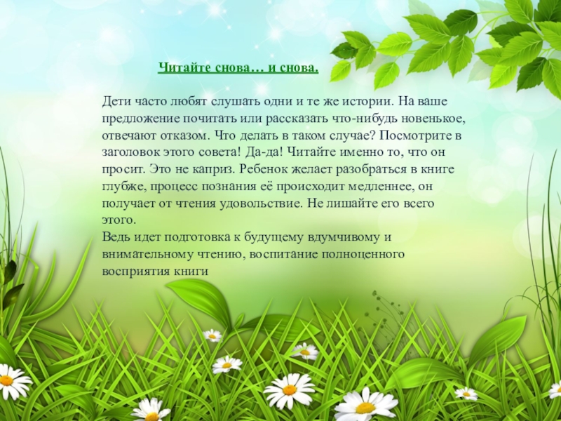 Дети часто любят слушать одни и те же истории. На ваше предложение почитать или рассказать что-нибудь новенькое, отвечают отказом. Что делать в таком случае? Посмотрите в заголовок этого совета! Да-да! Читайте именно то, что он просит. Это не каприз. Ребенок желает разобраться в книге глубже, процесс познания её происходит медленнее, он получает от чтения удовольствие. Не лишайте его всего этого.