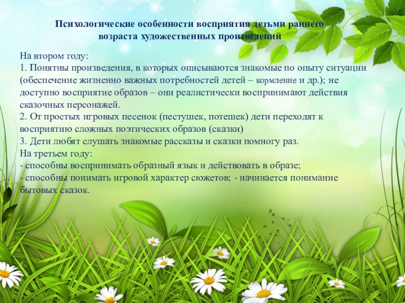Слайд 3Психологические особенности восприятия детьми раннего возраста художественных произведений