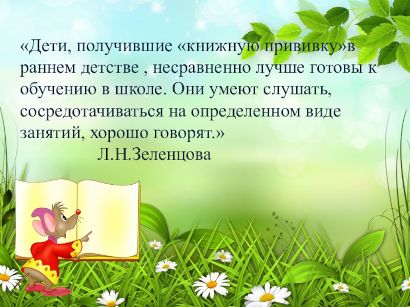 Слайд 2«Дети, получившие «книжную прививку»в раннем детстве , несравненно лучше готовы к