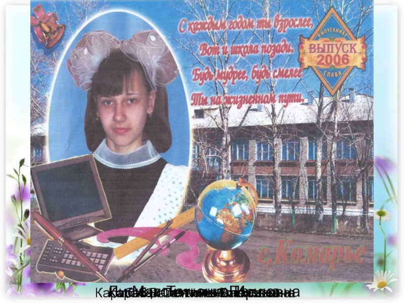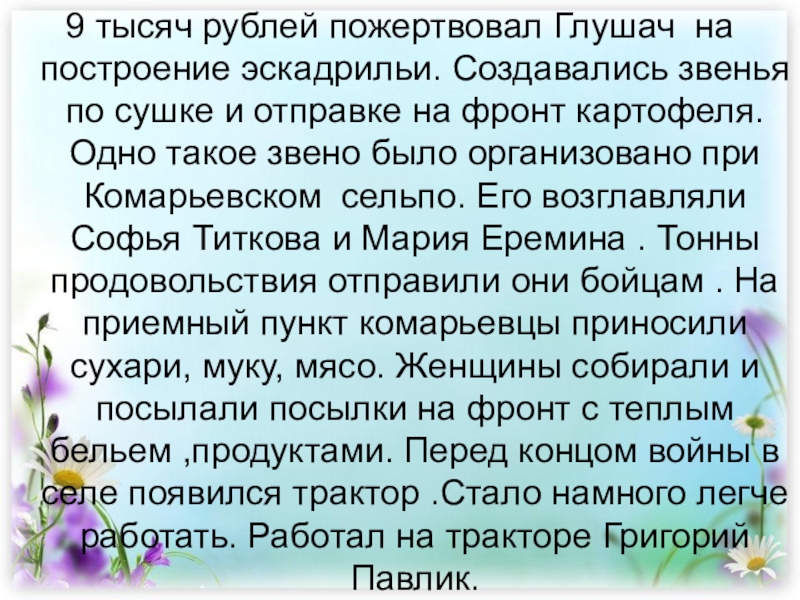 сушке и отправке на фронт картофеля. Одно такое звено было организовано при Комарьевском сельпо. Его возглавляли Софья Титкова и Мария Еремина . Тонны продовольствия отправили они бойцам . На приемный пункт комарьевцы приносили сухари, муку, мясо. Женщины собирали и посылали посылки на фронт с теплым бельем ,продуктами. Перед концом войны в селе появился трактор .Стало намного легче работать. Работал на тракторе Григорий Павлик.