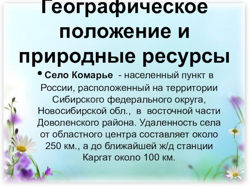 расположенный на территории Сибирского федерального округа, Новосибирской обл., в восточной части Доволенского района. Удаленность села от областного центра составляет около 250 км., а до ближайшей ж/д станции Каргат около 100 км.