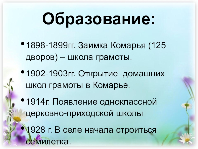1898-1899гг. Заимка Комарья (125 дворов) – школа грамоты.