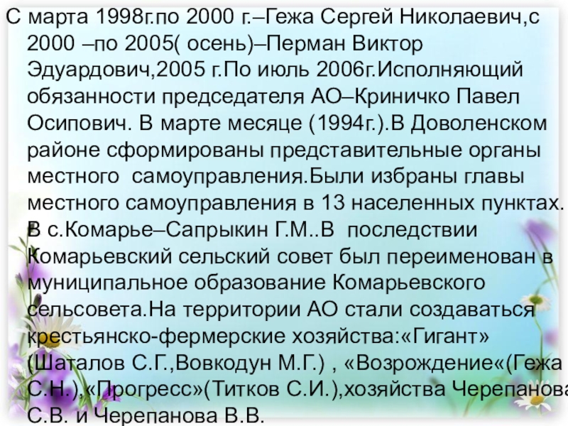 Виктор Эдуардович,2005 г.По июль 2006г.Исполняющий обязанности председателя АО–Криничко Павел Осипович. В марте месяце (1994г.).В Доволенском районе сформированы представительные органы местного самоуправления.Были избраны главы местного самоуправления в 13 населенных пунктах.В с.Комарье–Сапрыкин Г.М..В последствии Комарьевский сельский совет был переименован в муниципальное образование Комарьевского сельсовета.На территории АО стали создаваться крестьянско-фермерские хозяйства:«Гигант»(Шаталов С.Г.,Вовкодун М.Г.) , «Возрождение«(Гежа С.Н.),«Прогресс»(Титков С.И.),хозяйства Черепанова С.В. и Черепанова В.В.