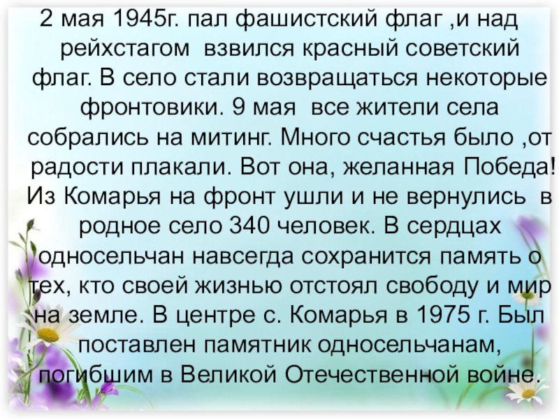 советский флаг. В село стали возвращаться некоторые фронтовики. 9 мая все жители села собрались на митинг. Много счастья было ,от радости плакали. Вот она, желанная Победа!Из Комарья на фронт ушли и не вернулись в родное село 340 человек. В сердцах односельчан навсегда сохранится память о тех, кто своей жизнью отстоял свободу и мир на земле. В центре с. Комарья в 1975 г. Был поставлен памятник односельчанам, погибшим в Великой Отечественной войне.