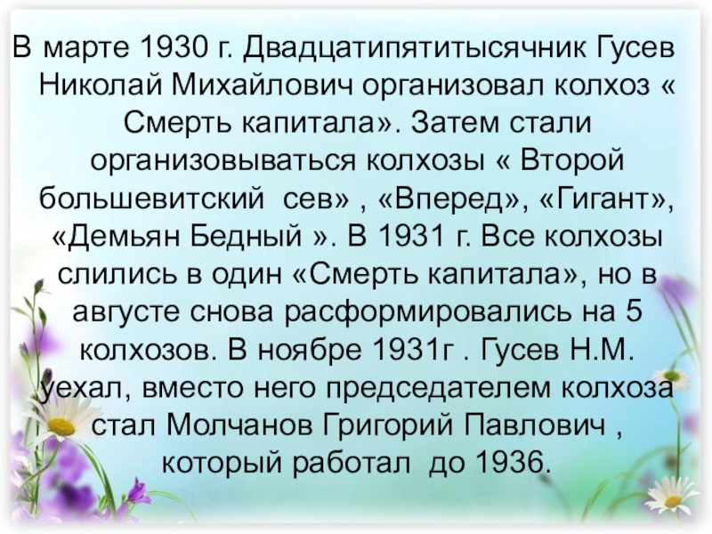 Смерть капитала». Затем стали организовываться колхозы « Второй большевитский сев» , «Вперед», «Гигант», «Демьян Бедный ». В 1931 г. Все колхозы слились в один «Смерть капитала», но в августе снова расформировались на 5 колхозов. В ноябре 1931г . Гусев Н.М. уехал, вместо него председателем колхоза стал Молчанов Григорий Павлович , который работал до 1936.