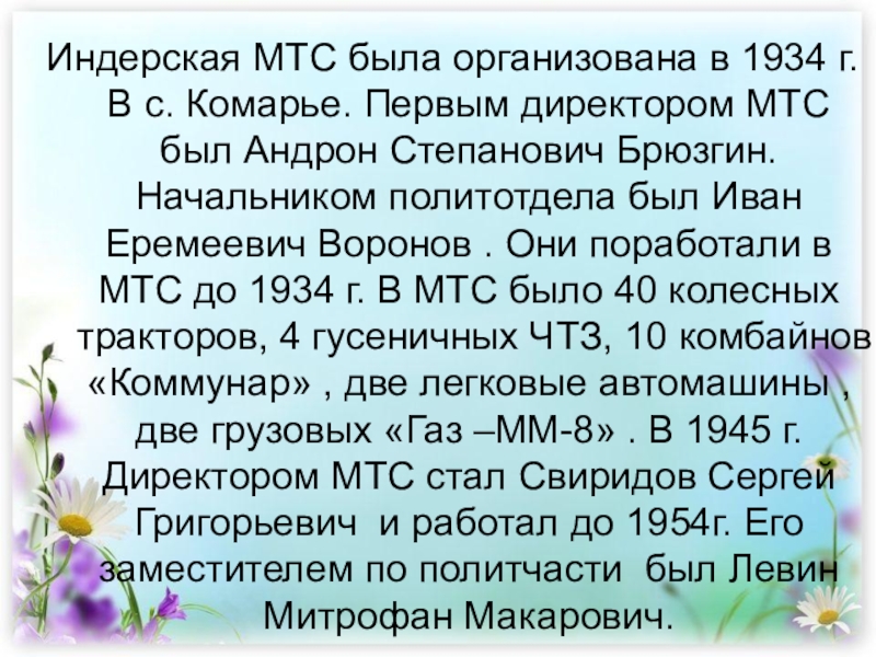 Слайд 30Индерская МТС была организована в 1934 г. В с. Комарье. Первым