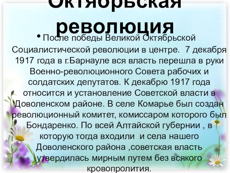 1917 года в г.Барнауле вся власть перешла в руки Военно-революционного Совета рабочих и солдатских депутатов. К декабрю 1917 года относится и установление Советской власти в Доволенском районе. В селе Комарье был создан революционный комитет, комиссаром которого был Бондаренко. По всей Алтайской губернии , в которую тогда входили и села нашего Доволенского района ,советская власть утвердилась мирным путем без всякого кровопролития.