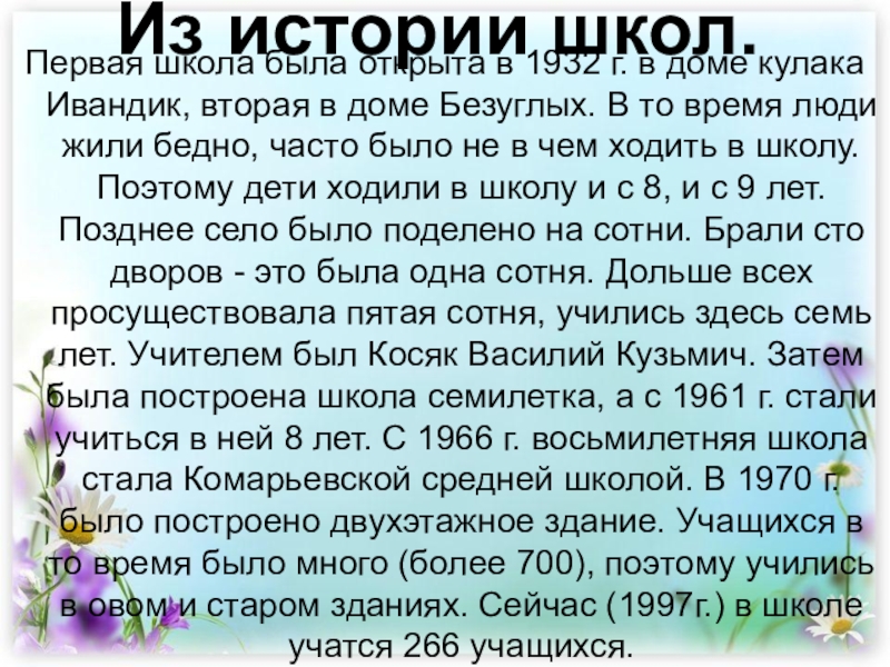 кулака Ивандик, вторая в доме Безуглых. В то время люди жили бедно, часто было не в чем ходить в школу. Поэтому дети ходили в школу и с 8, и с 9 лет. Позднее село было поделено на сотни. Брали сто дворов - это была одна сотня. Дольше всех просуществовала пятая сотня, учились здесь семь лет. Учителем был Косяк Василий Кузьмич. Затем была построена школа семилетка, а с 1961 г. стали учиться в ней 8 лет. С 1966 г. восьмилетняя школа стала Комарьевской средней школой. В 1970 г. было построено двухэтажное здание. Учащихся в то время было много (более 700), поэтому учились в овом и старом зданиях. Сейчас (1997г.) в школе учатся 266 учащихся.