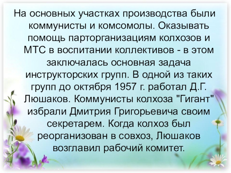 колхозов и МТС в воспитании коллективов - в этом заключалась основная задача инструкторских групп. В одной из таких групп до октября 1957 г. работал Д.Г.Люшаков. Коммунисты колхоза "Гигант" избрали Дмитрия Григорьевича своим секретарем. Когда колхоз был реорганизован в совхоз, Люшаков возглавил рабочий комитет.