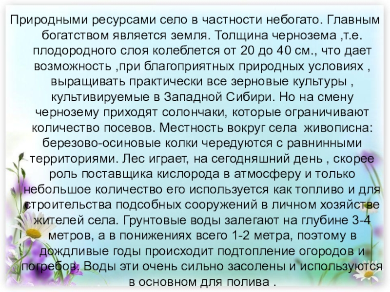 Слайд 9Природными ресурсами село в частности небогато. Главным богатством является земля. Толщина