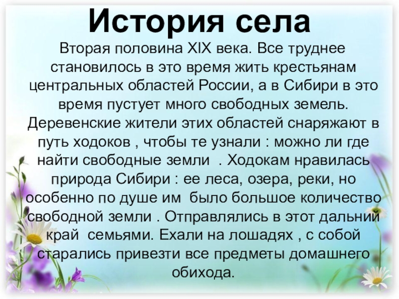 в это время жить крестьянам центральных областей России, а в Сибири в это время пустует много свободных земель. Деревенские жители этих областей снаряжают в путь ходоков , чтобы те узнали : можно ли где найти свободные земли . Ходокам нравилась природа Сибири : ее леса, озера, реки, но особенно по душе им было большое количество свободной земли . Отправлялись в этот дальний край семьями. Ехали на лошадях , с собой старались привезти все предметы домашнего обихода.