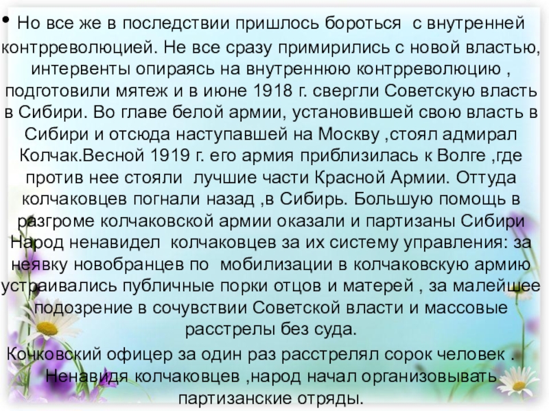 все сразу примирились с новой властью, интервенты опираясь на внутреннюю контрреволюцию ,подготовили мятеж и в июне 1918 г. свергли Советскую власть в Сибири. Во главе белой армии, установившей свою власть в Сибири и отсюда наступавшей на Москву ,стоял адмирал Колчак.Весной 1919 г. его армия приблизилась к Волге ,где против нее стояли лучшие части Красной Армии. Оттуда колчаковцев погнали назад ,в Сибирь. Большую помощь в разгроме колчаковской армии оказали и партизаны Сибири Народ ненавидел колчаковцев за их систему управления: за неявку новобранцев по мобилизации в колчаковскую армию устраивались публичные порки отцов и матерей , за малейшее подозрение в сочувствии Советской власти и массовые расстрелы без суда.