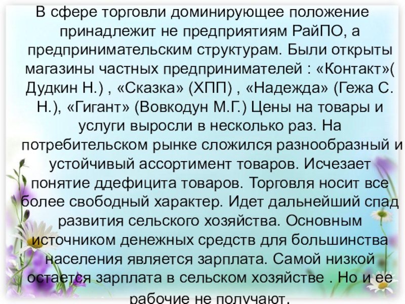 структурам. Были открыты магазины частных предпринимателей : «Контакт»( Дудкин Н.) , «Сказка» (ХПП) , «Надежда» (Гежа С.Н.), «Гигант» (Вовкодун М.Г.) Цены на товары и услуги выросли в несколько раз. На потребительском рынке сложился разнообразный и устойчивый ассортимент товаров. Исчезает понятие ддефицита товаров. Торговля носит все более свободный характер. Идет дальнейший спад развития сельского хозяйства. Основным источником денежных средств для большинства населения является зарплата. Самой низкой остается зарплата в сельском хозяйстве . Но и ее рабочие не получают.