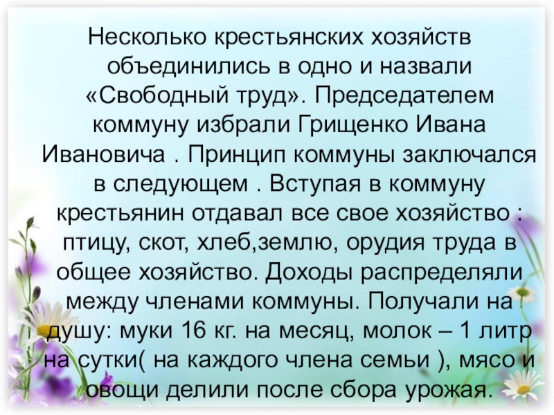 коммуну избрали Грищенко Ивана Ивановича . Принцип коммуны заключался в следующем . Вступая в коммуну крестьянин отдавал все свое хозяйство : птицу, скот, хлеб,землю, орудия труда в общее хозяйство. Доходы распределяли между членами коммуны. Получали на душу: муки 16 кг. на месяц, молок – 1 литр на сутки( на каждого члена семьи ), мясо и овощи делили после сбора урожая.