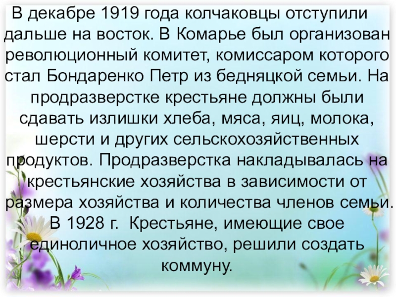 был организован революционный комитет, комиссаром которого стал Бондаренко Петр из бедняцкой семьи. На продразверстке крестьяне должны были сдавать излишки хлеба, мяса, яиц, молока, шерсти и других сельскохозяйственных продуктов. Продразверстка накладывалась на крестьянские хозяйства в зависимости от размера хозяйства и количества членов семьи. В 1928 г. Крестьяне, имеющие свое единоличное хозяйство, решили создать коммуну.