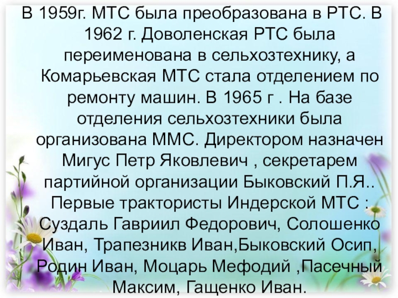 Слайд 32В 1959г. МТС была преобразована в РТС. В 1962 г. Доволенская