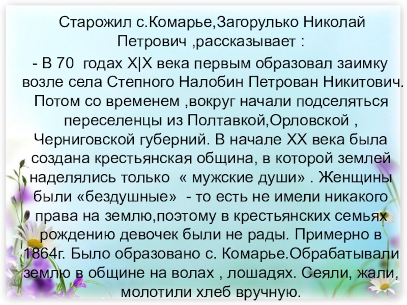 Слайд 17 Старожил с.Комарье,Загорулько Николай Петрович ,рассказывает :
