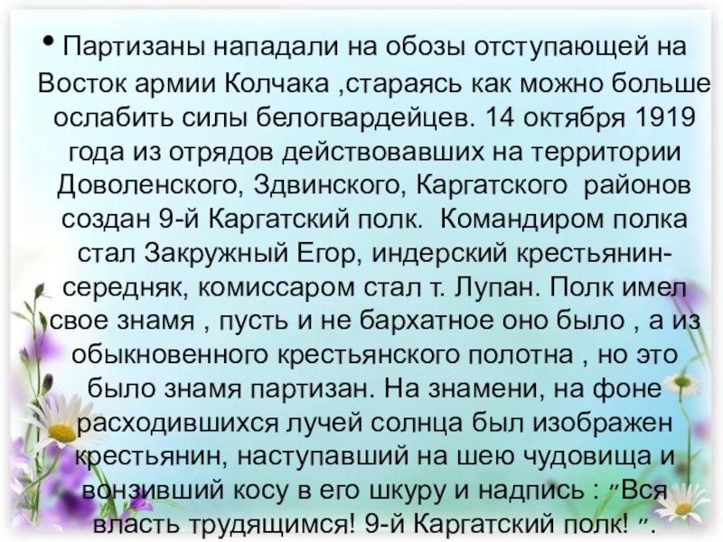 можно больше ослабить силы белогвардейцев. 14 октября 1919 года из отрядов действовавших на территории Доволенского, Здвинского, Каргатского районов создан 9-й Каргатский полк. Командиром полка стал Закружный Егор, индерский крестьянин- середняк, комиссаром стал т. Лупан. Полк имел свое знамя , пусть и не бархатное оно было , а из обыкновенного крестьянского полотна , но это было знамя партизан. На знамени, на фоне расходившихся лучей солнца был изображен крестьянин, наступавший на шею чудовища и вонзивший косу в его шкуру и надпись : ״Вся власть трудящимся! 9-й Каргатский полк! ״.