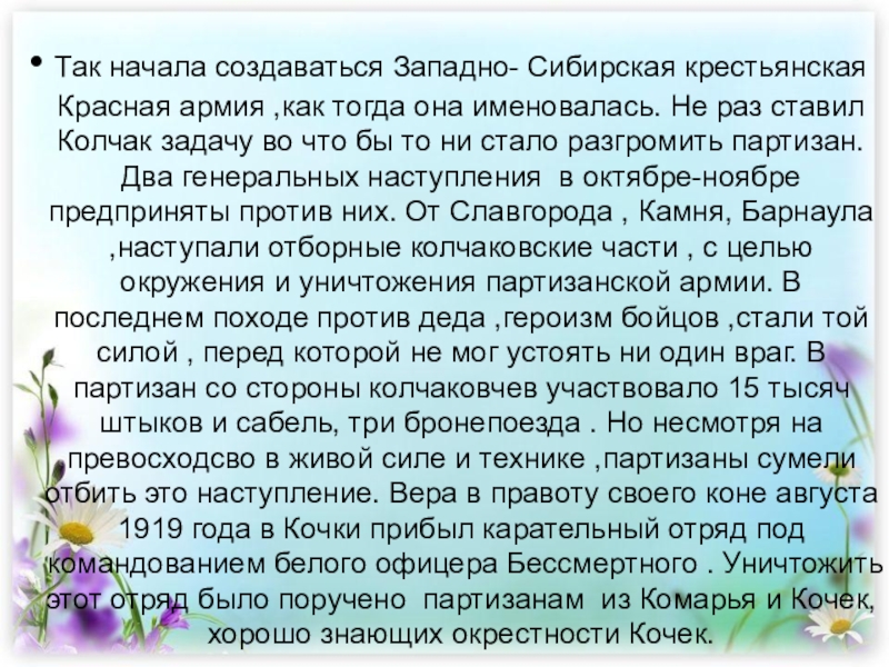 именовалась. Не раз ставил Колчак задачу во что бы то ни стало разгромить партизан. Два генеральных наступления в октябре-ноябре предприняты против них. От Славгорода , Камня, Барнаула ,наступали отборные колчаковские части , с целью окружения и уничтожения партизанской армии. В последнем походе против деда ,героизм бойцов ,стали той силой , перед которой не мог устоять ни один враг. В партизан со стороны колчаковчев участвовало 15 тысяч штыков и сабель, три бронепоезда . Но несмотря на превосходсво в живой силе и технике ,партизаны сумели отбить это наступление. Вера в правоту своего коне августа 1919 года в Кочки прибыл карательный отряд под командованием белого офицера Бессмертного . Уничтожить этот отряд было поручено партизанам из Комарья и Кочек, хорошо знающих окрестности Кочек.