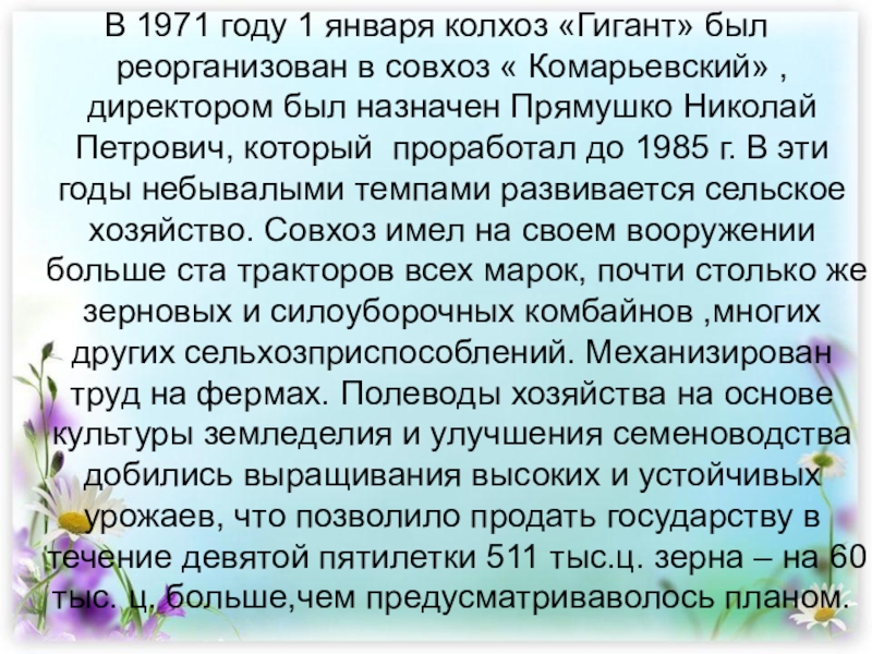 « Комарьевский» , директором был назначен Прямушко Николай Петрович, который проработал до 1985 г. В эти годы небывалыми темпами развивается сельское хозяйство. Совхоз имел на своем вооружении больше ста тракторов всех марок, почти столько же зерновых и силоуборочных комбайнов ,многих других сельхозприспособлений. Механизирован труд на фермах. Полеводы хозяйства на основе культуры земледелия и улучшения семеноводства добились выращивания высоких и устойчивых урожаев, что позволило продать государству в течение девятой пятилетки 511 тыс.ц. зерна – на 60 тыс. ц. больше,чем предусматриваволось планом.