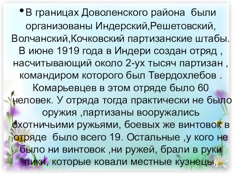 Слайд 22В границах Доволенского района были организованы Индерский,Решетовский, Волчанский,Кочковский партизанские штабы. В