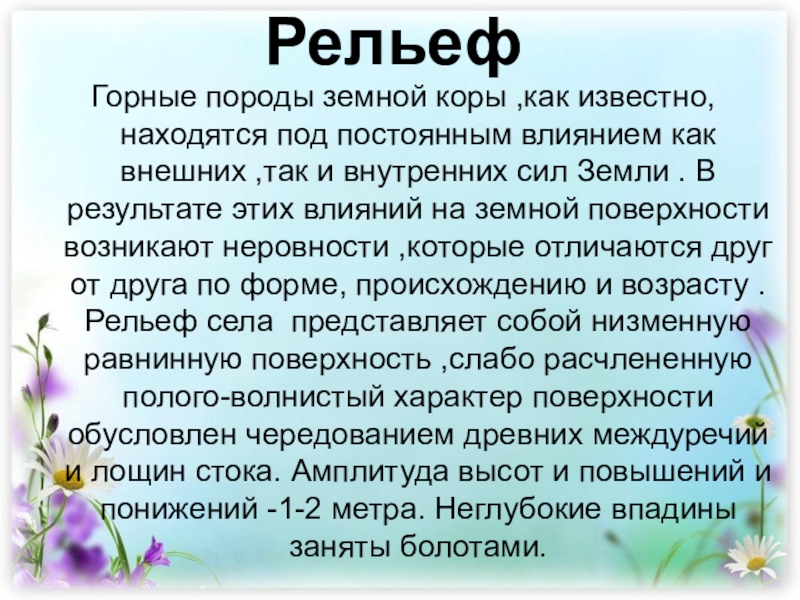 как внешних ,так и внутренних сил Земли . В результате этих влияний на земной поверхности возникают неровности ,которые отличаются друг от друга по форме, происхождению и возрасту . Рельеф села представляет собой низменную равнинную поверхность ,слабо расчлененную полого-волнистый характер поверхности обусловлен чередованием древних междуречий и лощин стока. Амплитуда высот и повышений и понижений -1-2 метра. Неглубокие впадины заняты болотами.