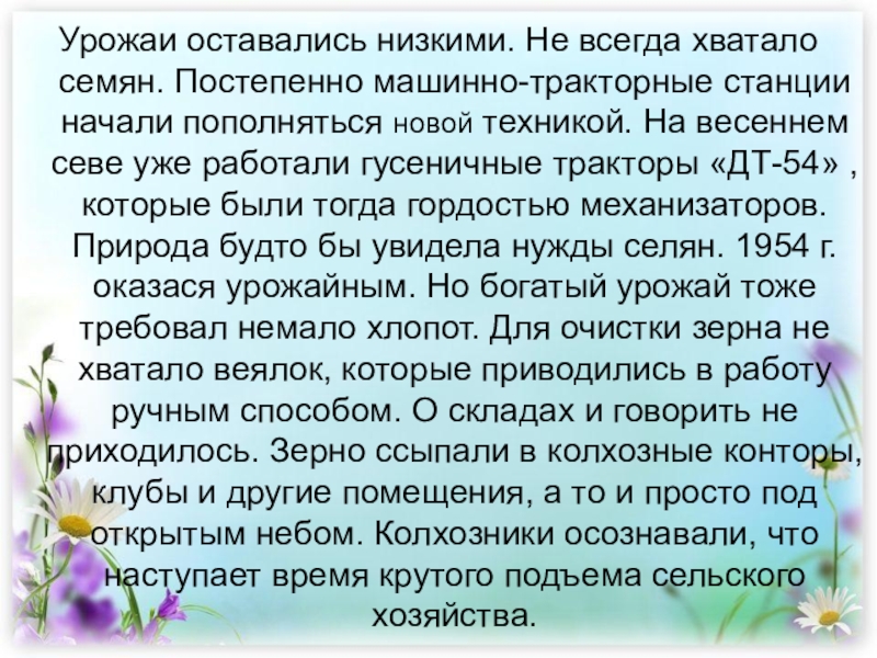 Слайд 40Урожаи оставались низкими. Не всегда хватало семян. Постепенно машинно-тракторные станции начали