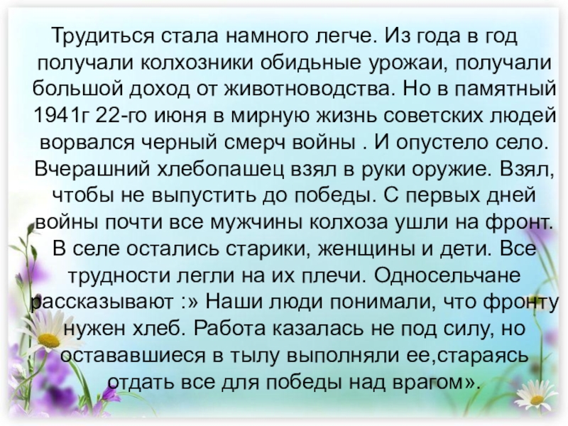 урожаи, получали большой доход от животноводства. Но в памятный 1941г 22-го июня в мирную жизнь советских людей ворвался черный смерч войны . И опустело село. Вчерашний хлебопашец взял в руки оружие. Взял,чтобы не выпустить до победы. С первых дней войны почти все мужчины колхоза ушли на фронт. В селе остались старики, женщины и дети. Все трудности легли на их плечи. Односельчане рассказывают :» Наши люди понимали, что фронту нужен хлеб. Работа казалась не под силу, но остававшиеся в тылу выполняли ее,стараясь отдать все для победы над врагом».
