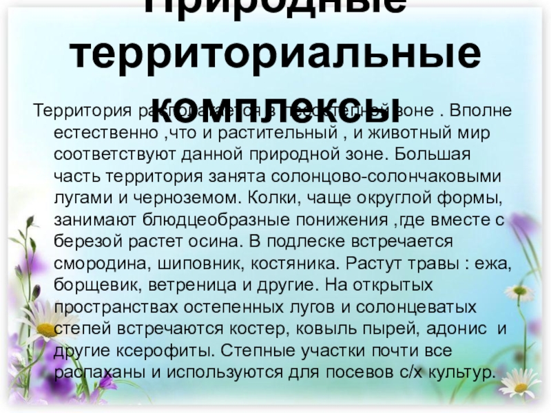 Территория располагается в лесостепной зоне . Вполне естественно ,что