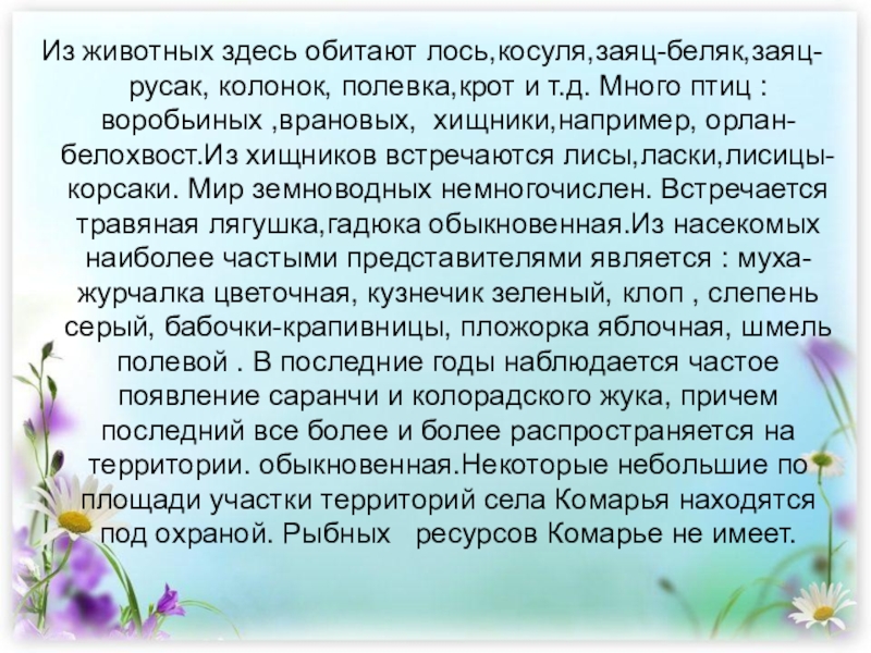 :воробьиных ,врановых, хищники,например, орлан-белохвост.Из хищников встречаются лисы,ласки,лисицы-корсаки. Мир земноводных немногочислен. Встречается травяная лягушка,гадюка обыкновенная.Из насекомых наиболее частыми представителями является : муха-журчалка цветочная, кузнечик зеленый, клоп , слепень серый, бабочки-крапивницы, пложорка яблочная, шмель полевой . В последние годы наблюдается частое появление саранчи и колорадского жука, причем последний все более и более распространяется на территории. обыкновенная.Некоторые небольшие по площади участки территорий села Комарья находятся под охраной. Рыбных ресурсов Комарье не имеет.