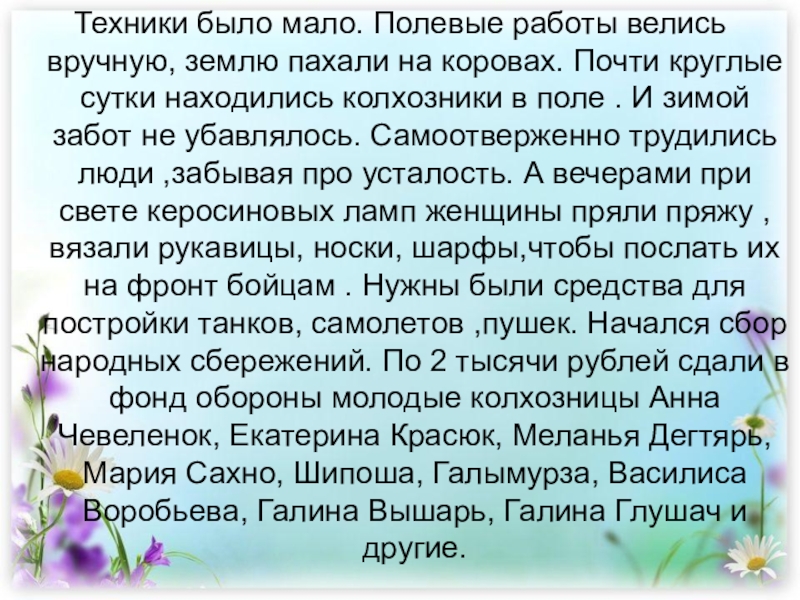 Почти круглые сутки находились колхозники в поле . И зимой забот не убавлялось. Самоотверженно трудились люди ,забывая про усталость. А вечерами при свете керосиновых ламп женщины пряли пряжу ,вязали рукавицы, носки, шарфы,чтобы послать их на фронт бойцам . Нужны были средства для постройки танков, самолетов ,пушек. Начался сбор народных сбережений. По 2 тысячи рублей сдали в фонд обороны молодые колхозницы Анна Чевеленок, Екатерина Красюк, Меланья Дегтярь, Мария Сахно, Шипоша, Галымурза, Василиса Воробьева, Галина Вышарь, Галина Глушач и другие.