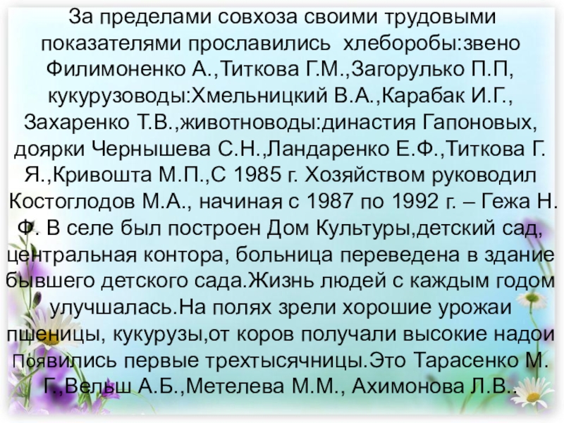 Слайд 45 За пределами совхоза своими трудовыми показателями прославились хлеборобы:звено Филимоненко