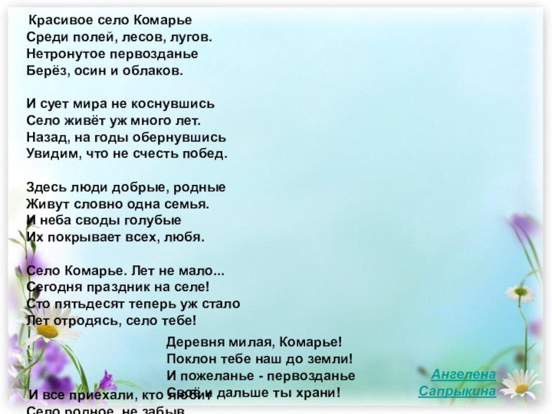 деревушки. Важной составляющей их является гражданская активность жителей села , школьников . Они осознают уникальность своей «маленькой Родины», ощущают