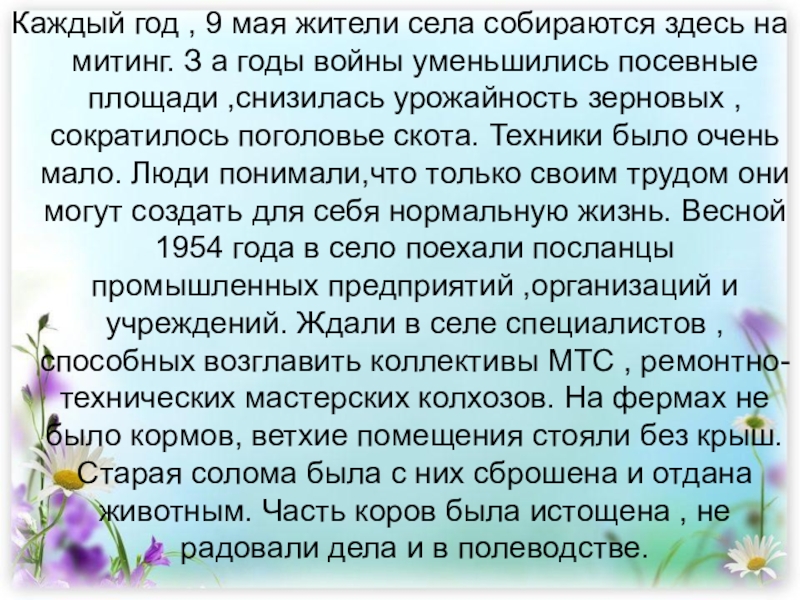 З а годы войны уменьшились посевные площади ,снизилась урожайность зерновых ,сократилось поголовье скота. Техники было очень мало. Люди понимали,что только своим трудом они могут создать для себя нормальную жизнь. Весной 1954 года в село поехали посланцы промышленных предприятий ,организаций и учреждений. Ждали в селе специалистов ,способных возглавить коллективы МТС , ремонтно-технических мастерских колхозов. На фермах не было кормов, ветхие помещения стояли без крыш. Старая солома была с них сброшена и отдана животным. Часть коров была истощена , не радовали дела и в полеводстве.