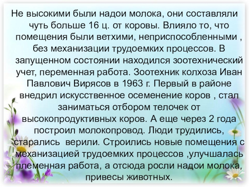 от коровы. Влияло то, что помещения были ветхими, неприспособленными ,без механизации трудоемких процессов. В запущенном состоянии находился зоотехнический учет, переменная работа. Зоотехник колхоза Иван Павлович Вирясов в 1963 г. Первый в районе внедрил искусственное осеменение коров , стал заниматься отбором телочек от высокопродуктивных коров. А еще через 2 года построил молокопровод. Люди трудились, старались верили. Строились новые помещения с механизацией трудоемких процессов ,улучшалась племенная работа, а отсюда росли надои молока, привесы животных.