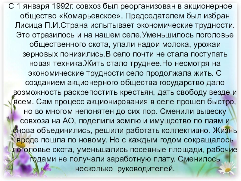 Слайд 46С 1 января 1992г. совхоз был реорганизован в акционерное общество «Комарьевское».