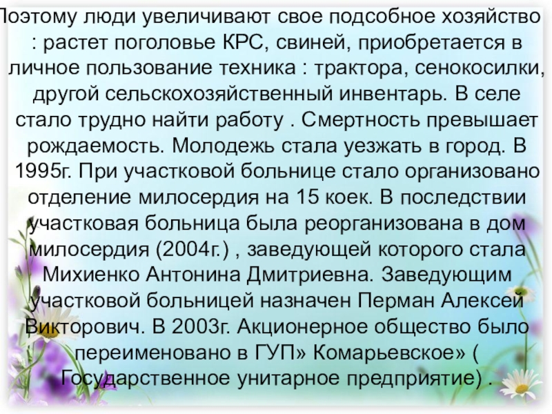 приобретается в личное пользование техника : трактора, сенокосилки, другой сельскохозяйственный инвентарь. В селе стало трудно найти работу . Смертность превышает рождаемость. Молодежь стала уезжать в город. В 1995г. При участковой больнице стало организовано отделение милосердия на 15 коек. В последствии участковая больница была реорганизована в дом милосердия (2004г.) , заведующей которого стала Михиенко Антонина Дмитриевна. Заведующим участковой больницей назначен Перман Алексей Викторович. В 2003г. Акционерное общество было переименовано в ГУП» Комарьевское» ( Государственное унитарное предприятие) .