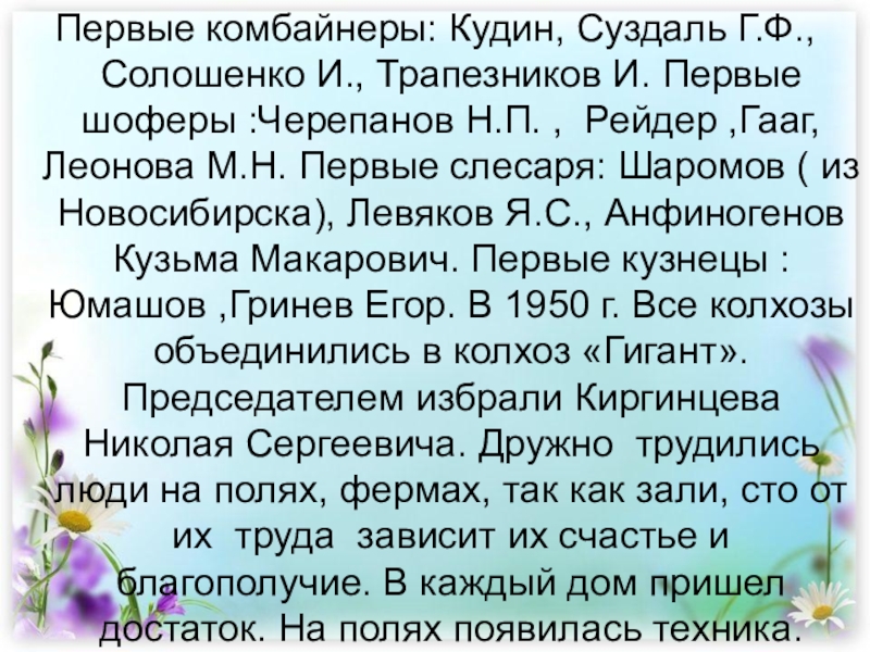 :Черепанов Н.П. , Рейдер ,Гааг, Леонова М.Н. Первые слесаря: Шаромов ( из Новосибирска), Левяков Я.С., Анфиногенов Кузьма Макарович. Первые кузнецы : Юмашов ,Гринев Егор. В 1950 г. Все колхозы объединились в колхоз «Гигант». Председателем избрали Киргинцева Николая Сергеевича. Дружно трудились люди на полях, фермах, так как зали, сто от их труда зависит их счастье и благополучие. В каждый дом пришел достаток. На полях появилась техника.