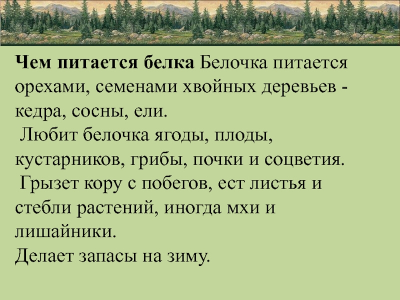 Слайд 8Чем питается белка Белочка питается орехами, семенами хвойных деревьев -кедра, сосны,