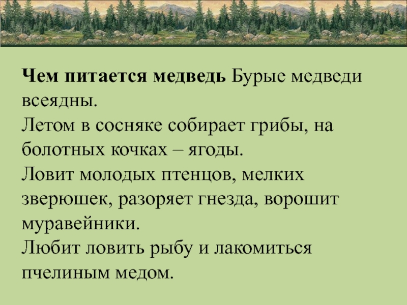 Слайд 4Чем питается медведь Бурые медведи всеядны.