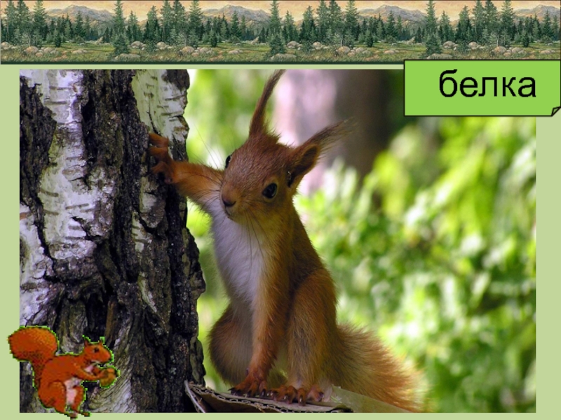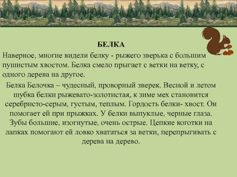 Белка Белочка – чудесный, проворный зверек. Весной и летом шубка белки рыжевато-золотистая, к зиме мех становится серебристо-серым, густым, теплым. Гордость белки- хвост. Он помогает ей при прыжках. У белки выпуклые, черные глаза. Зубы большие, изогнутые, очень острые. Цепкие коготки на лапках помогают ей ловко хвататься за ветки, перепрыгивать с дерева на дерево.