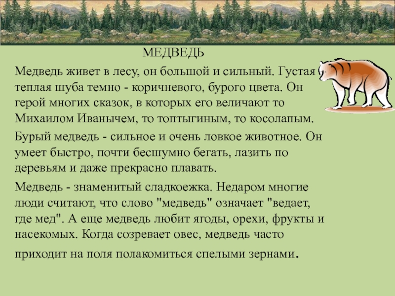 Медведь - знаменитый сладкоежка. Недаром многие люди считают, что слово "медведь" означает "ведает, где мед". А еще медведь любит ягоды, орехи, фрукты и насекомых. Когда созревает овес, медведь часто приходит на поля полакомиться спелыми зернами.