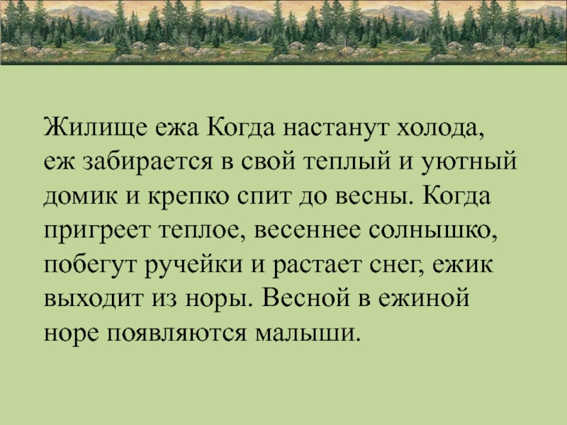 уютный домик и крепко спит до весны. Когда пригреет теплое, весеннее солнышко, побегут ручейки и растает снег, ежик выходит из норы. Весной в ежиной норе появляются малыши.