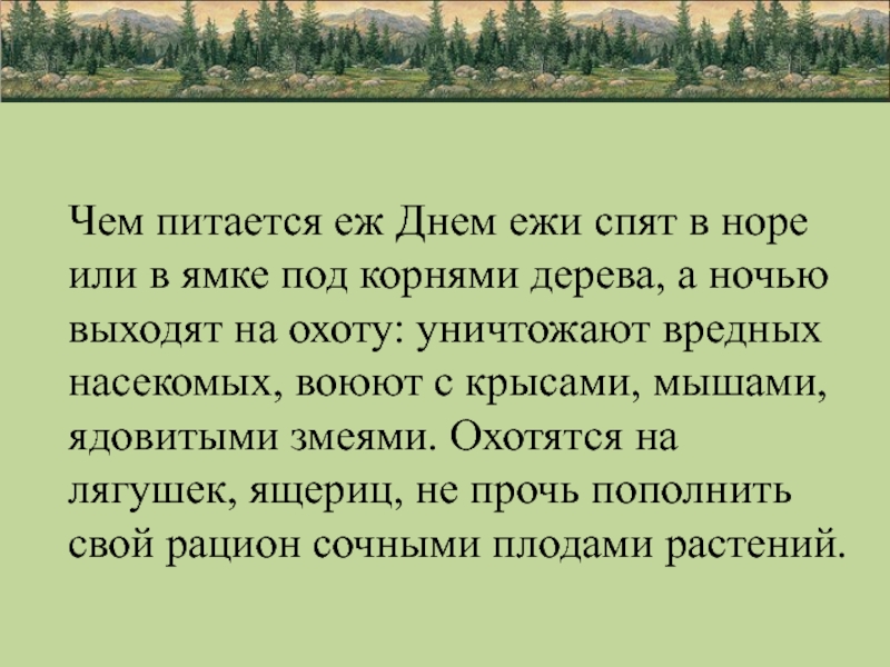 Слайд 12Чем питается еж Днем ежи спят в норе или в ямке