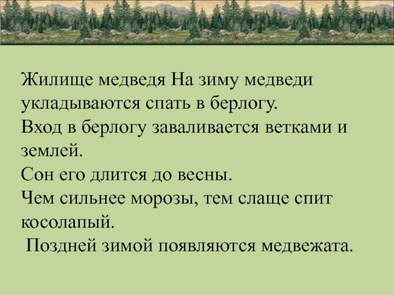 Слайд 5Жилище медведя На зиму медведи укладываются спать в берлогу.