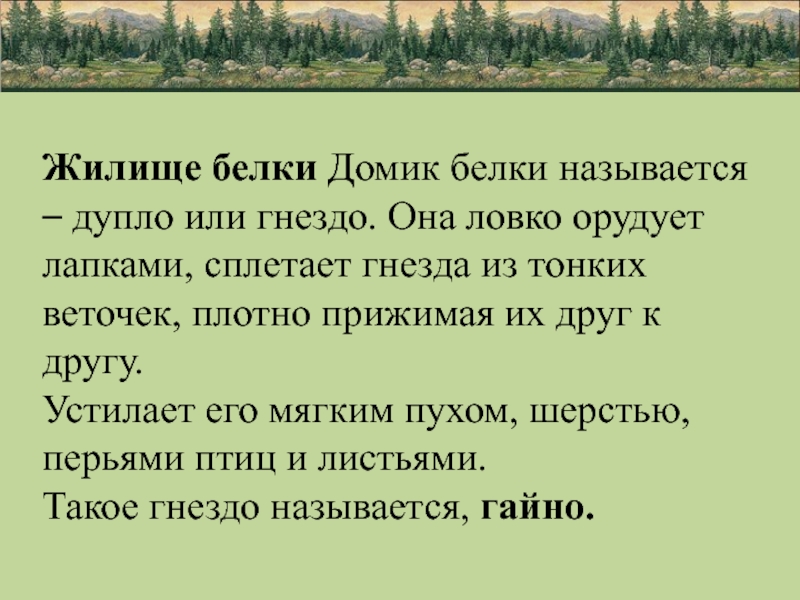 Слайд 9Жилище белки Домик белки называется – дупло или гнездо. Она ловко