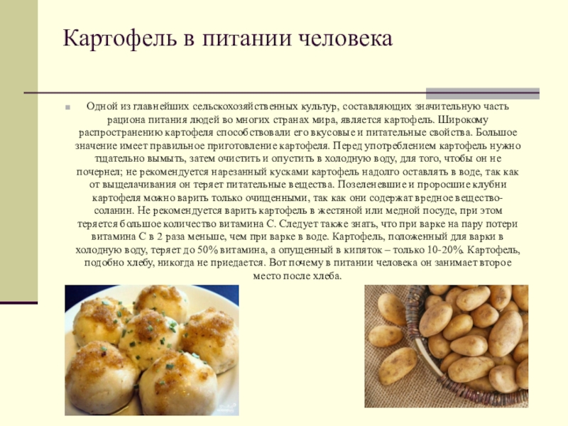 рациона питания людей во многих странах мира, является картофель. Широкому распространению картофеля способствовали его вкусовые и питательные свойства. Большое значение имеет правильное приготовление картофеля. Перед употреблением картофель нужно тщательно вымыть, затем очистить и опустить в холодную воду, для того, чтобы он не почернел; не рекомендуется нарезанный кусками картофель надолго оставлять в воде, так как от выщелачивания он теряет питательные вещества. Позеленевшие и проросшие клубни картофеля можно варить только очищенными, так как они содержат вредное вещество-соланин. Не рекомендуется варить картофель в жестяной или медной посуде, при этом теряется большое количество витамина С. Следует также знать, что при варке на пару потери витамина С в 2 раза меньше, чем при варке в воде. Картофель, положенный для варки в холодную воду, теряет до 50% витамина, а опущенный в кипяток – только 10-20%. Картофель, подобно хлебу, никогда не приедается. Вот почему в питании человека он занимает второе место после хлеба.