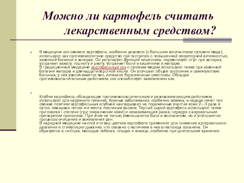 сок свежего картофеля, особенно розового (с большим количеством лугового меда), используют как противокислотное средство при гастритах с повышенной секреторной активностью, язвенной болезни и запорах. Он регулирует функций кишечника, нормализует стул при запорах, устраняет изжогу, тошноту и рвоту, устраняет боли в кишечнике и желудке.